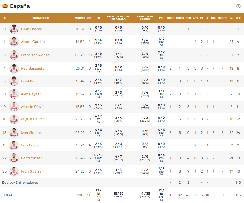España afrontaba el último cuarto con una renta de +24 puntos (70-46), que se elevó hasta los 31 puntos (90-61) con Santi Yusta como máximo anotador (17) puntos, seguido en esta faceta por Izan Almansa (10) en otro encuentro donde tan solo un jugador español se ha quedado sin anotar, en esta ocasión, el lesionado Gran Osobor.