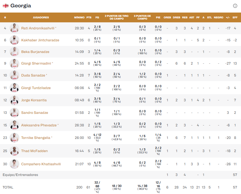 | (22+11+13+15): Andronikashvili (4), Phevadze (2), D. Sanadze (7), Shengelia (10X), Shermadini (8)- cinco inicial-, Jintcharadze (0), Burjanadze (3), Turdziladze (4), Korsantia (6), S. Sanadze (2), McFadden (5), Khatiashvili (10). |