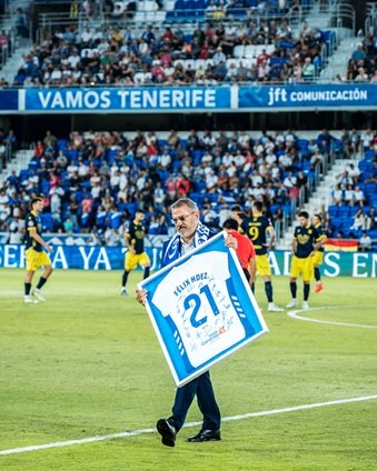 Félix Hernández, que lució la bufanda del Tenerife, agradeció a Felipe Miñambres, presidente del CD Tenerife, este detallazo. El presi del basket siguió el choque desde el palco de autoridades y festejó, como un tinerfeño y aficionado más, cada uno de los tres goles del Tete.
