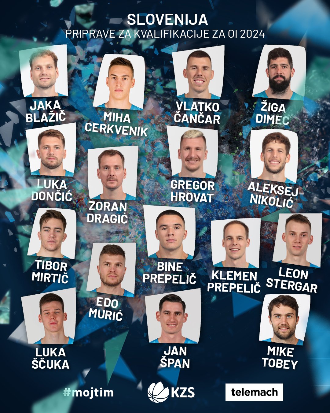 Luka Doncic, Klemen Prepelic, Jaka Blazic, Zoran Dragic, Mike Tobey, Vlatko Cancar, Aleksej Nikolic, Ziga Dimec, Gregor Hrovat, Edo Muric, Miha Cerkvenik, Tibor Mirtic, Luka Scuka, Bine Prepelic, Leon Stergar, Jan Span.