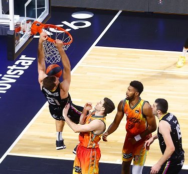 Acorta diferencias Valencia Basket con un 0-5 (45-34) con Gio sumando desde el 4,60 (47-34). Restan 2:30. Recuperación defensiva, ataque rápido, asistencia de Jaime y mate de Shermadini (49-34) con «minuto» solicitado por el coach visitante.