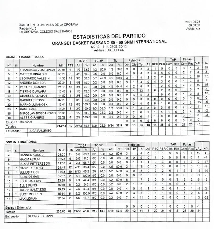 Leonardo Valesin (18 pts y 4 reb) fue el jugador más destacado de los italianos, mientras que Julius Price (19 pts 3 reb) sobresalió por el bando estadounidense.